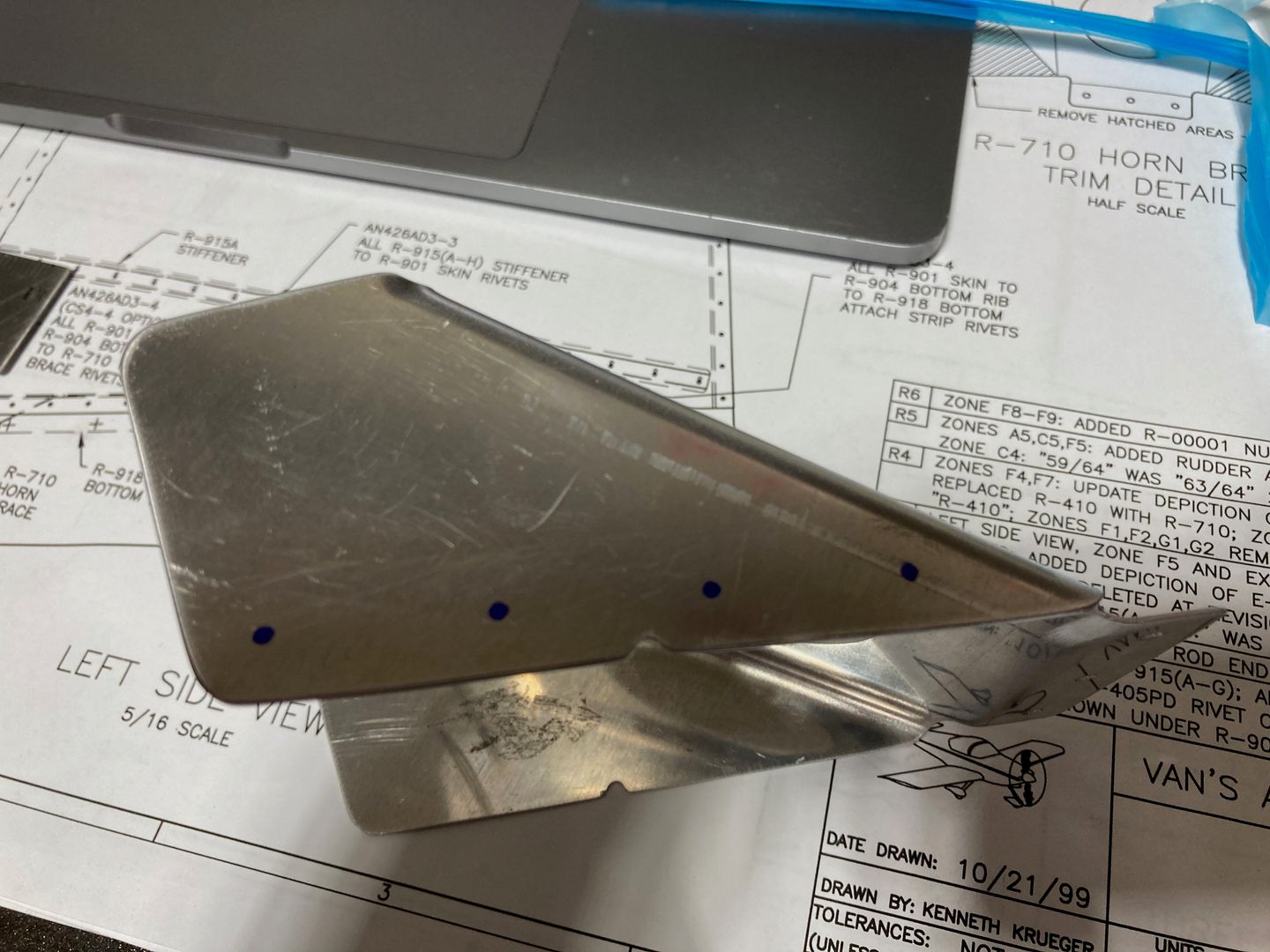 Trimmed the horn brace. I knew that there might be edge issues with this part, so I left a generous amount of material (note the tooling hole on the edge). Plenty of edge distance!