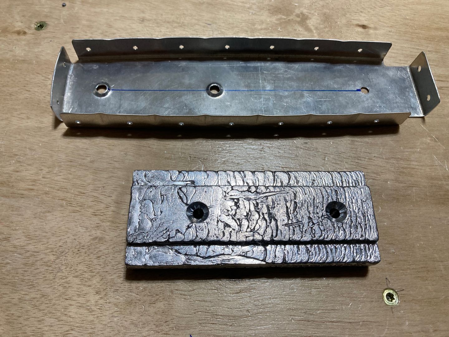 Then I moved to the counterbalance weight. I drilled the hole for the screw (using a #12 drill bit), then dimpled the counterbalance rib and counter-sunk the lead weight. I used a manual deburring tool with the countersinking bit installed. The lead is so soft that a couple of turns is all you need. I counter-sunk until the weight sits flat to the rib.
