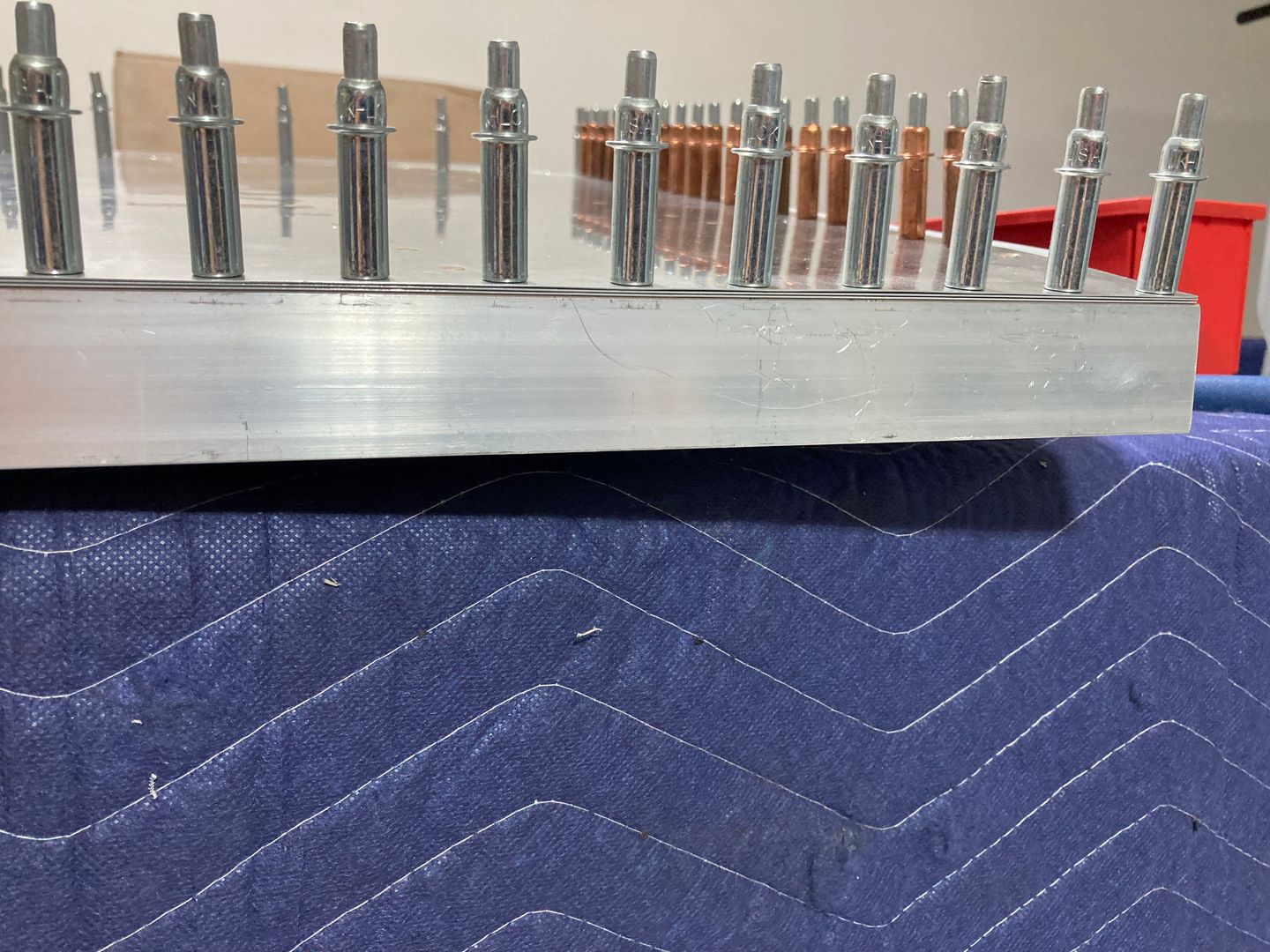 Then I considered different ways of aligning the holes for drilling. One option was to make some sort of a locating pin such that it gives the correct spacing. However, I decided not to do that. The issue with that approach would be that it will accumulate any error in the distance of the pin. 0.001" of an error would accumulate to 0.045" (there are 46 holes, so 45 gaps between them).