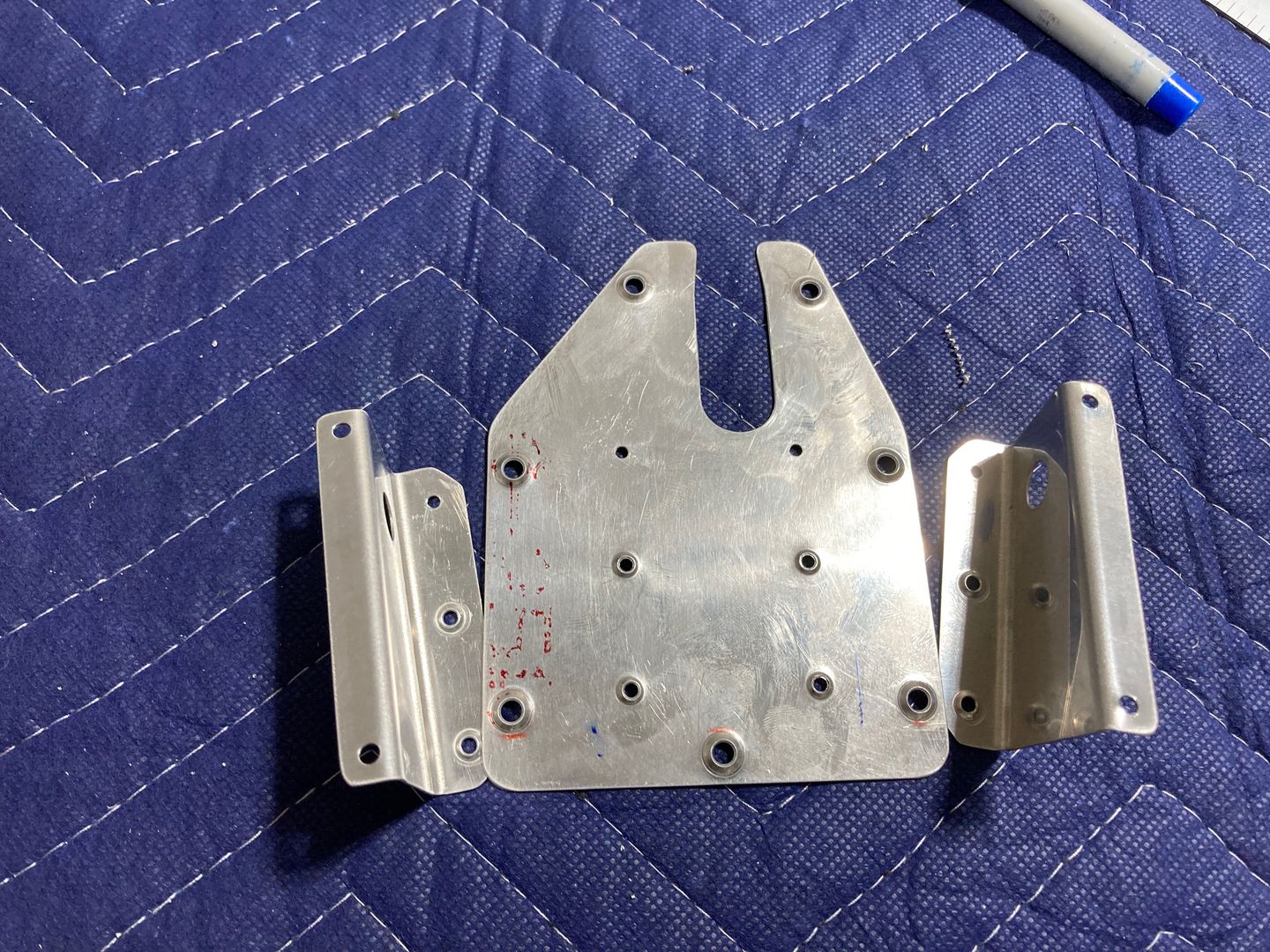 Then I drilled the support brackets to the trim plate. Since these parts are small, I dimpled them before priming (I normally dimple after the priming to make scuffing easier). There are six holes, but I only dimpled the forward four. Based on others' experience, there is very little space above the aft two holes, so instead of dimpling the holes, I counter-sinked the trim plate for the NAS1097 ("oops") rivets, to leave enough space for the shop heads.