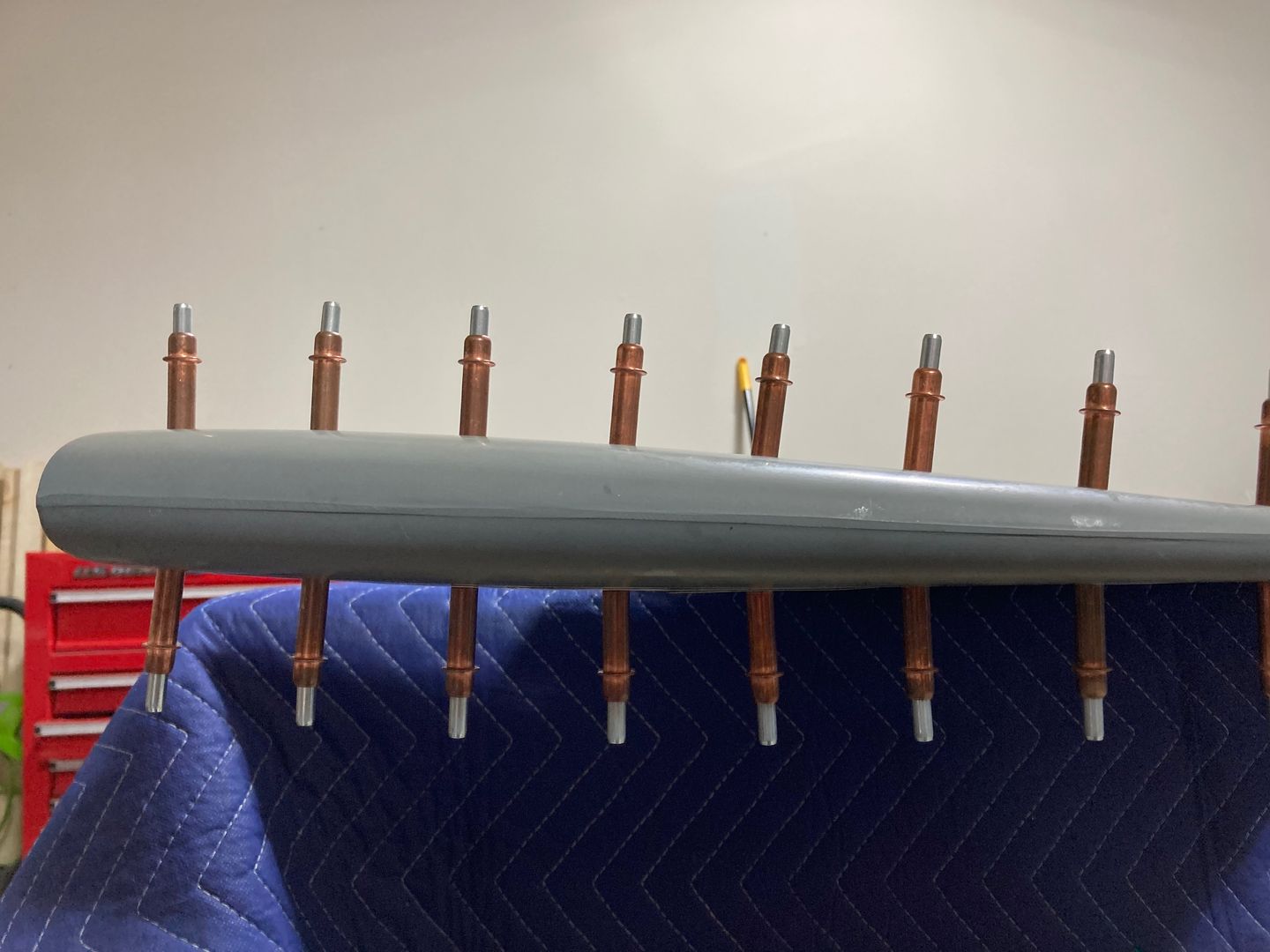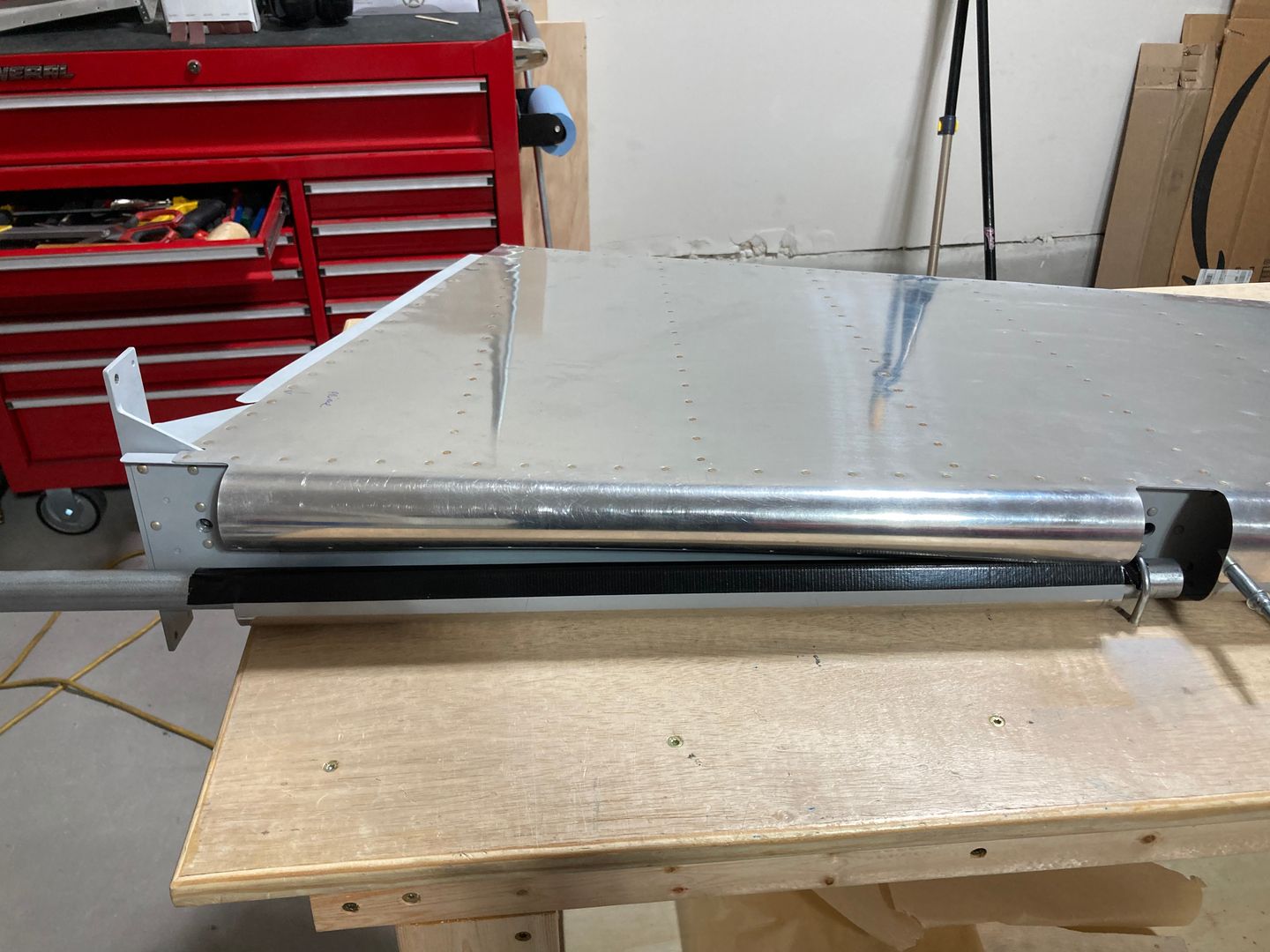 After that, I switched to rolling the leading edge. This time I attached the Gorilla tape along the edge (rather than multiple strips perpendicular to the edge), which worked much faster. I was concerned that the sticking force won't be enough, but I had no issues rolling the edges (also, the rudder skin is thinner than the elevator skins).