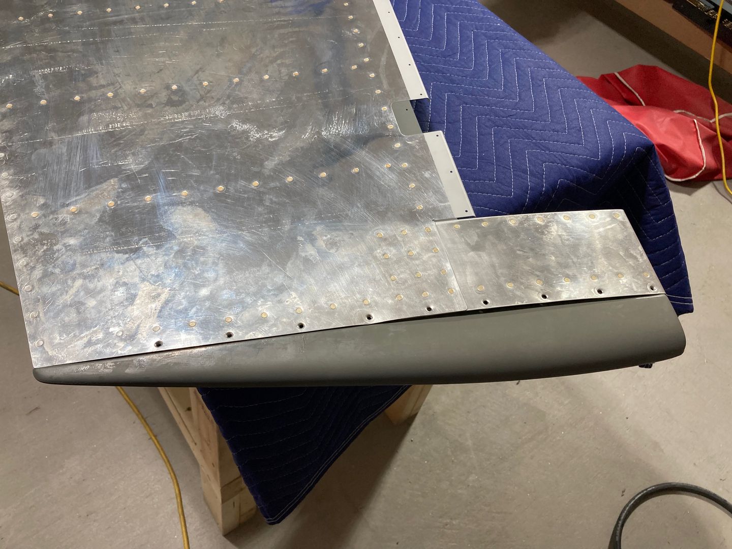 The first step was to glue some aluminum backing plates to the rudder fairing, to reinforce the rivet attachment areas.