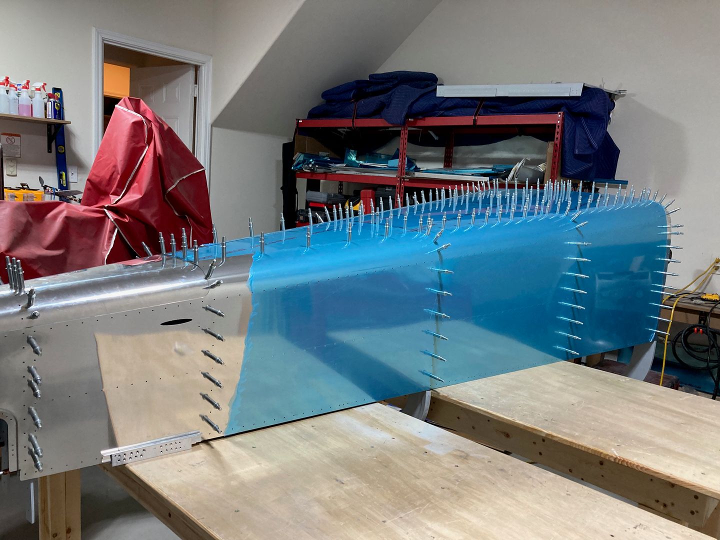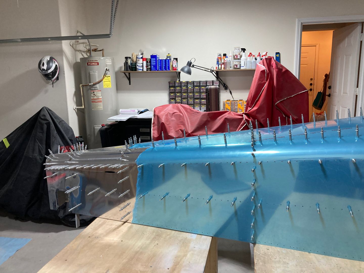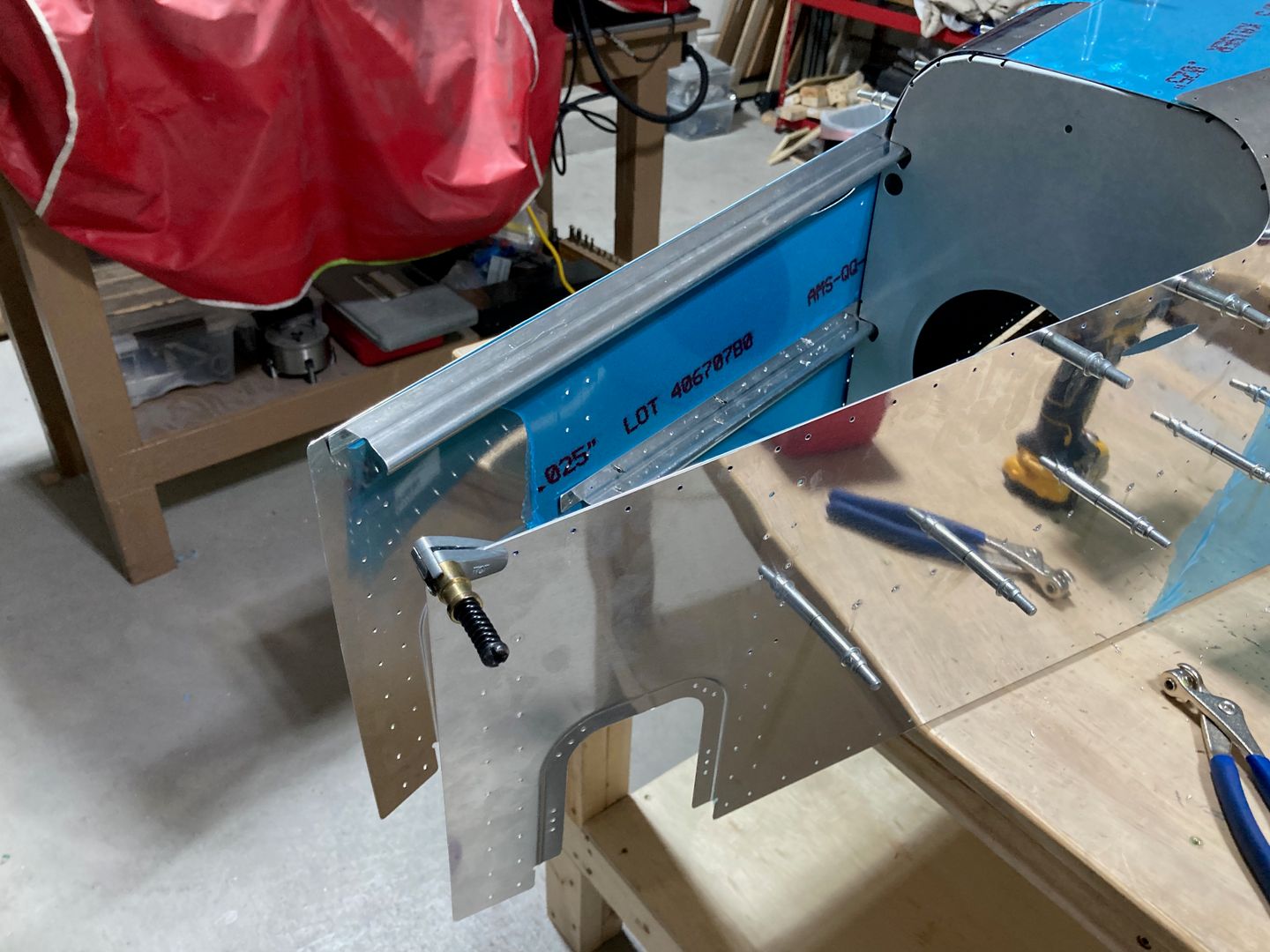 The aft part is where clecos were necessary to align the side skins and the aft bottom skin. Since these clecos were exactly in the holes I was supposed to use to drill the channel, I removed the bottom aft skin. This allowed me to drill the bottom channels to the side skins first, then use clecos to force everything back together.