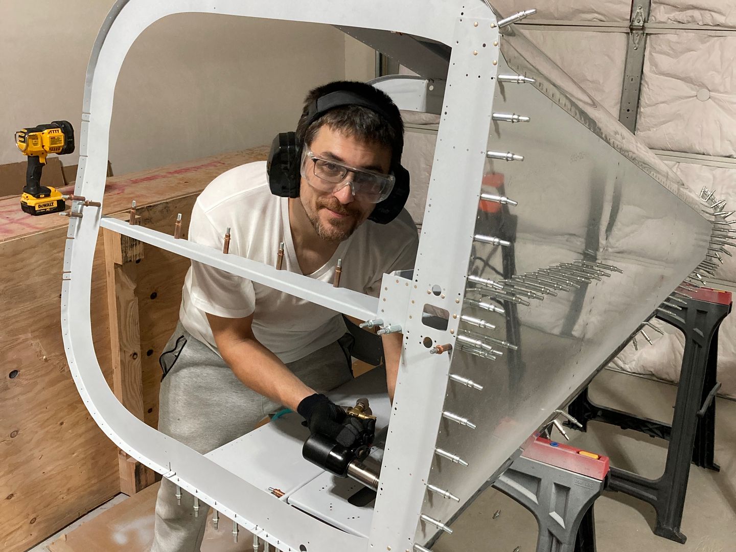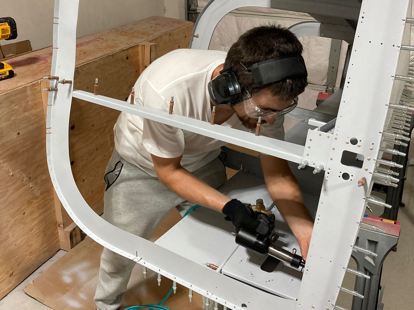 This is me pretending I am riveting. Obviously, fake, as you cannot back rivet without somebody holding the backing plate! However, at least I have proof it was me building the plane -- since I had somebody to take a photo of me!