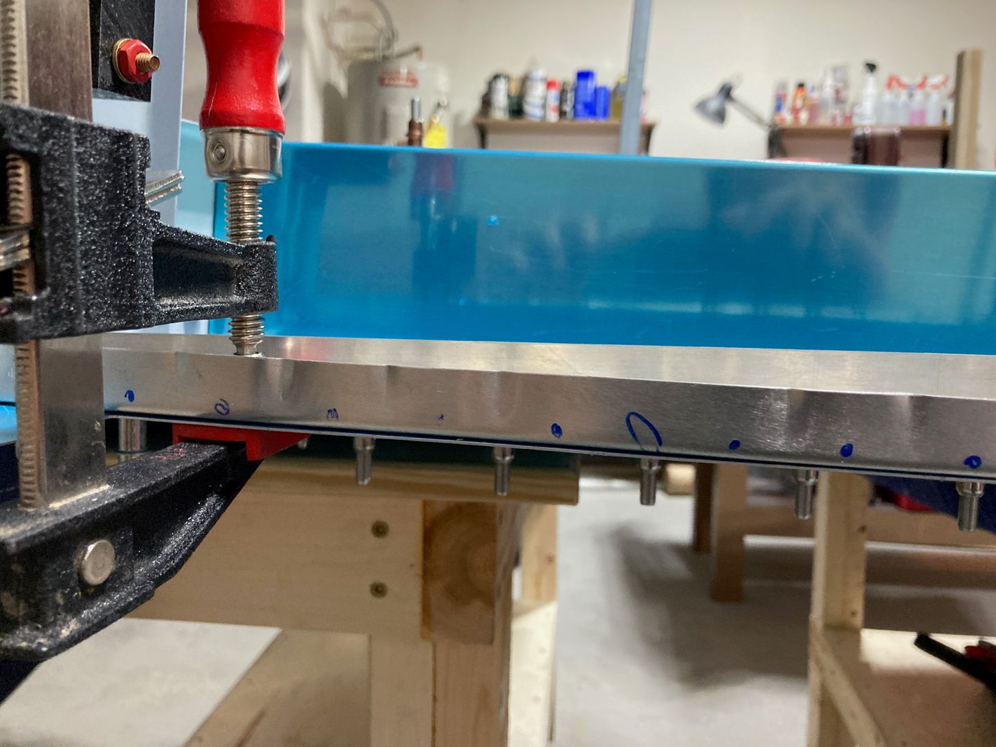 Then I started fitting the F-623 ribs. Due to the curvature of the front part of the rib, it needs some fluting. To flute it, I needed to know where are the holes from the skins so I know where I can flute. To find that, I temporarily clecoed the side skin and marked the location of the holes.