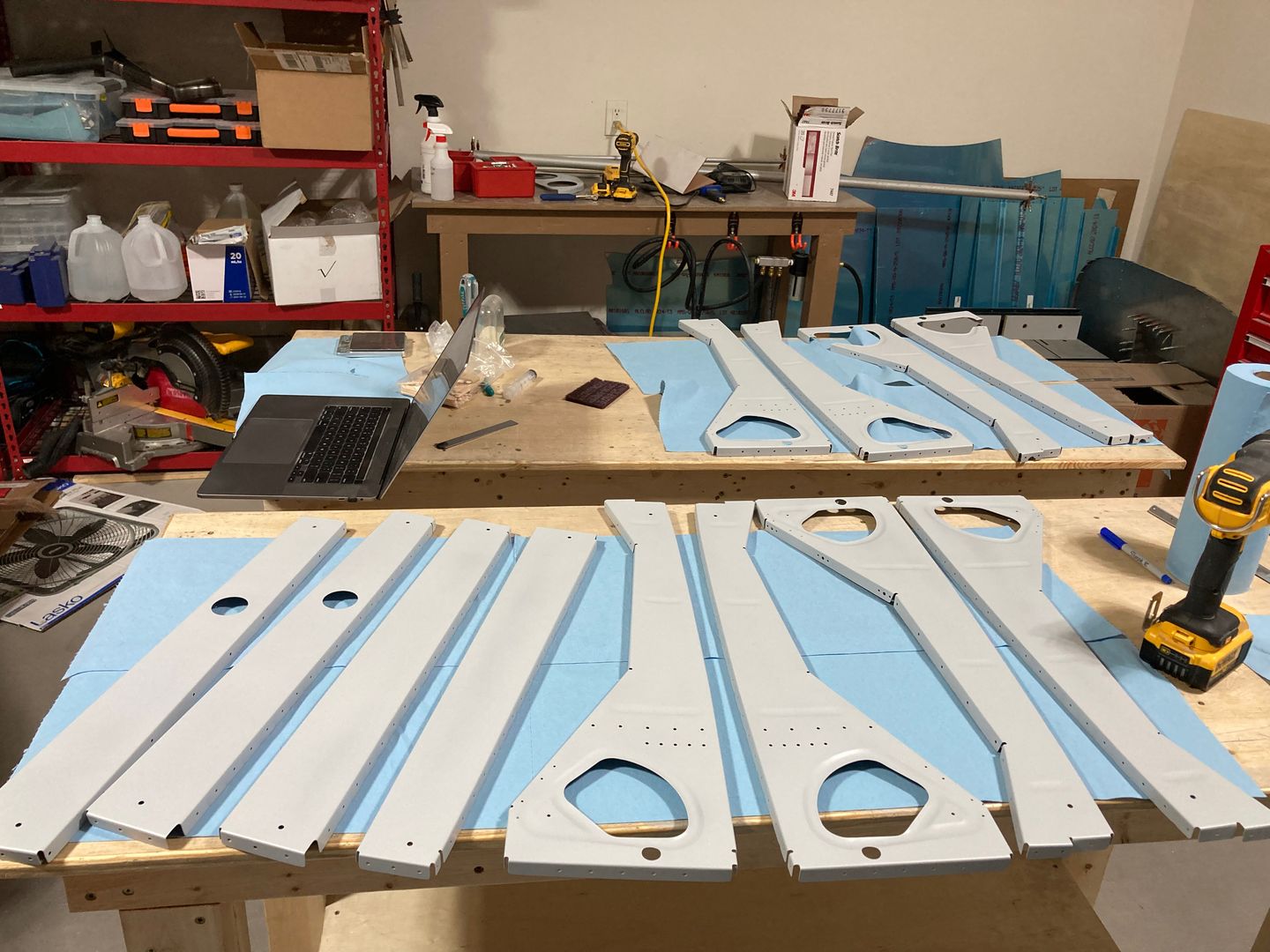 Priming the center section ribs6h October 22, 2022 A long priming session today. A lot of scuffing was done, all the seat ribs and the baggage ribs. And then everything was primed. ← Earlier Later →