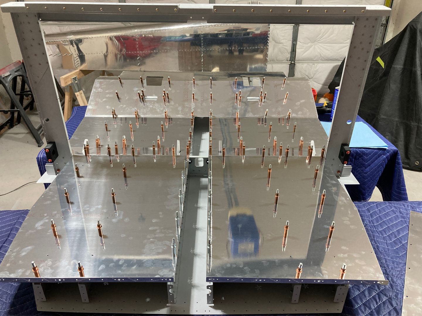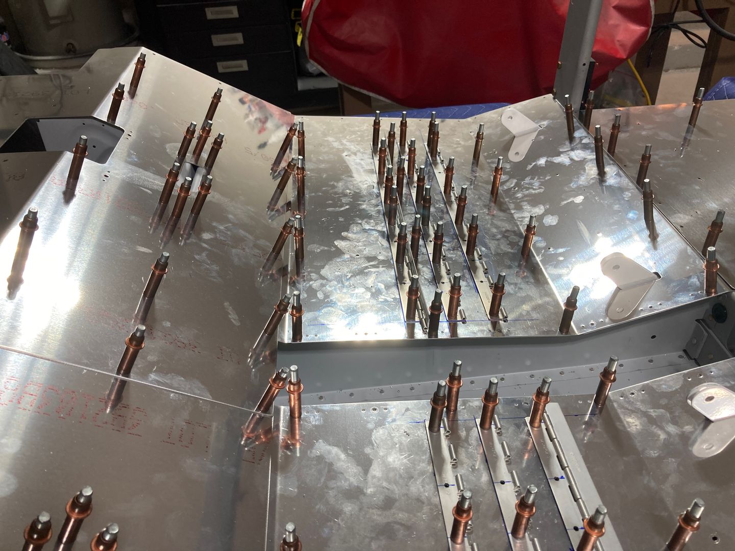 Also, some builders reported getting too small of the distance between some holes and the seat rib flanges, making it impossible to set the shop head on a hinge rivet (it would interfere with the rib flange). However, the dimensions Vans' provide in the plans worked for me. My guess is that maybe these builders measured the lateral position of the hinges differently from what I did? I used 7/8" inches from the edge of the floor. However, at least one builder I saw used what looked like 7/8" from the centers of the holes on the edge of the floor (moving the hinge outboard a bit).