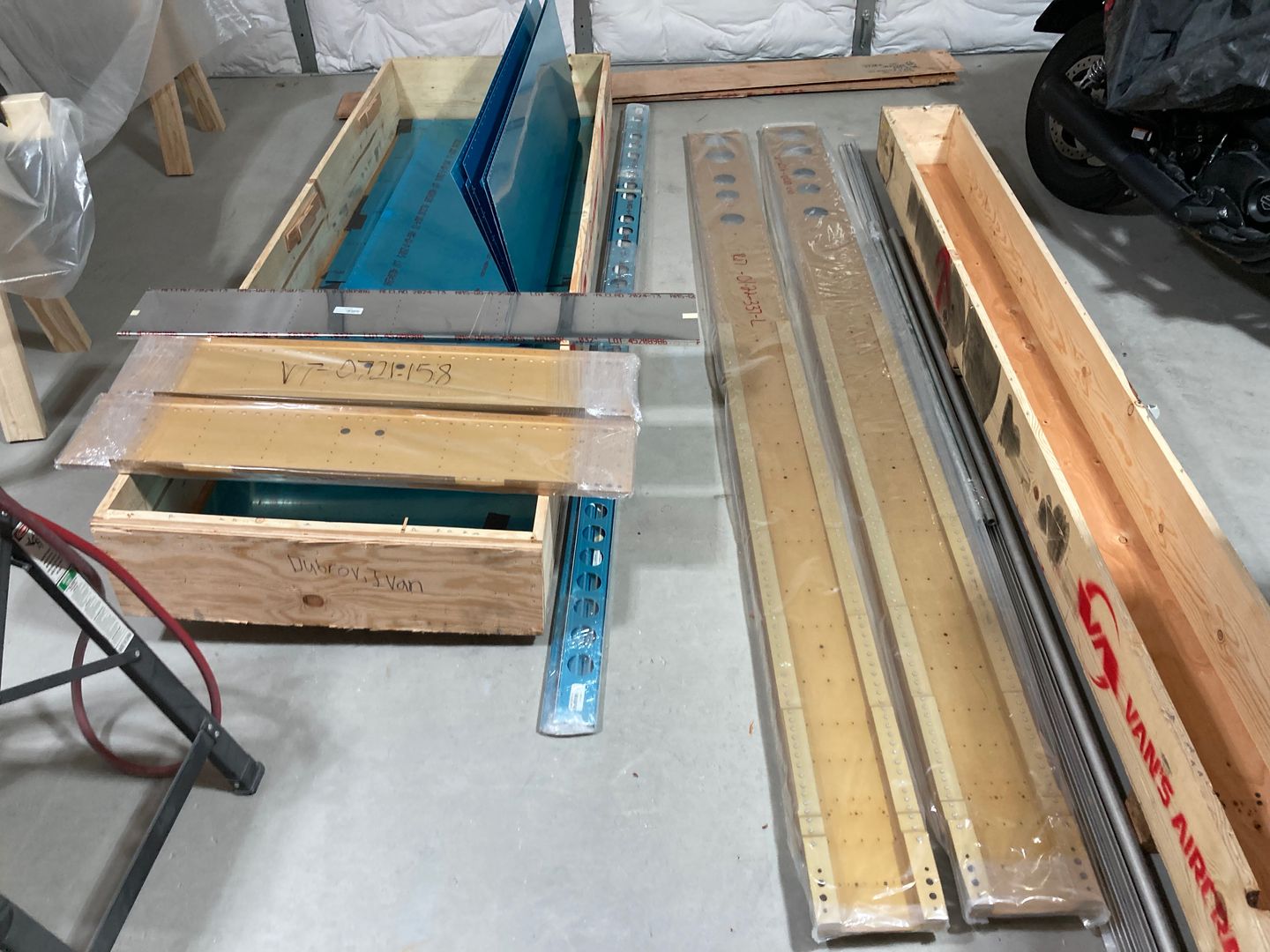 While I was looking at the crates, I got an e-mail from Van's asking me to confirm I received the notification about the quality issues they had with some parts (aileron nose ribs). Due to missed heat treatment step, these parts cracked during forming. I looked at the parts I got, and turned out they were from the "good" batch (the bad batch is from August/September of 2022, and my parts are from September 2021). The parts looked good, too.