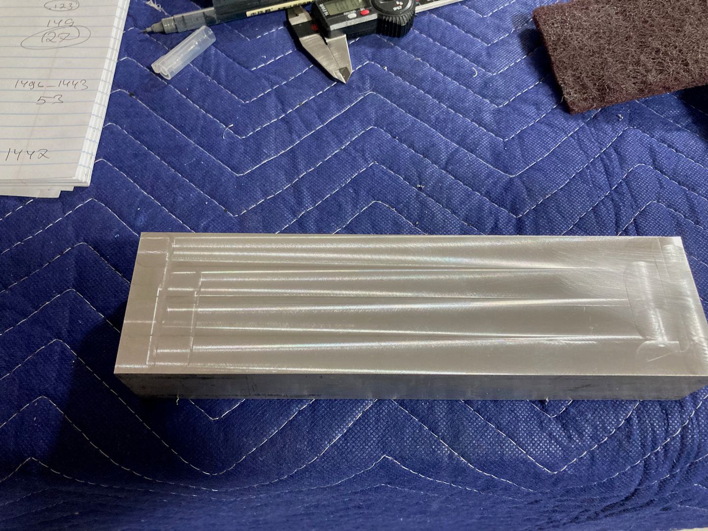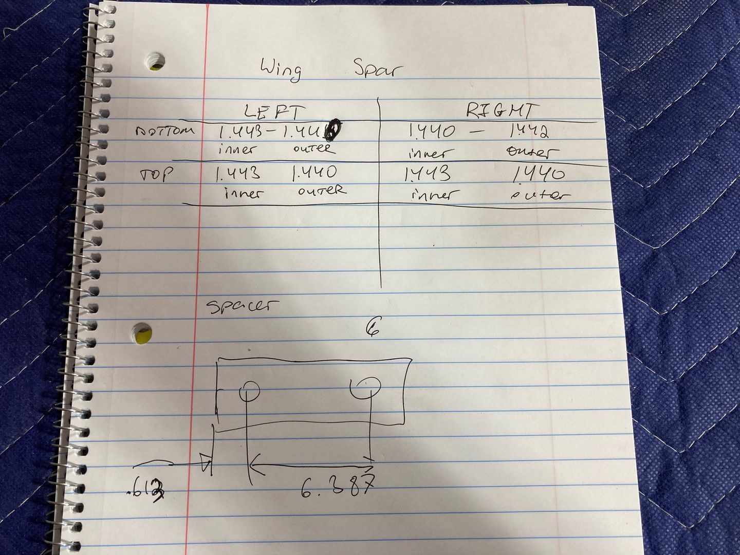 I measured the spars in two places: closer to the tip and closer to the outermost attachment bolt. There is some variation between the two measurements, but both spars seem to be in the range of 1.440" to 1.443". So I decided to make spacers on the upper side of that, 1.443" (assuming that bolts will pull parts together to close the remaining 0.003" if I get it).