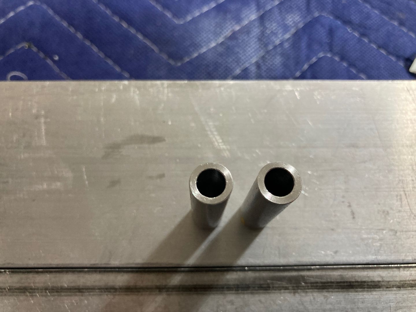 However, the provided spacers were 1.438", plus they had rough edges (so they would be even shorter after sanding). Since I did not have any aluminum tubing, I tried to make the spacers from the round aluminum stock.