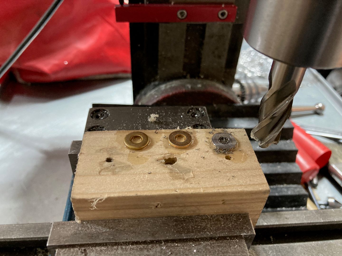 Since I torqued the control column mounts, I decided to get a better fit for the control column. I measured the gaps using the feeler gauges, then machined washers to fit. I machined the piece of wood with the end mill, glued washers with CA glue, and machined them to the desired thickness. When I was making the second washer, I glued three washers as I thought I will need more of them. However, it turned out I only needed one, so two washers went straight to a garbage bin.