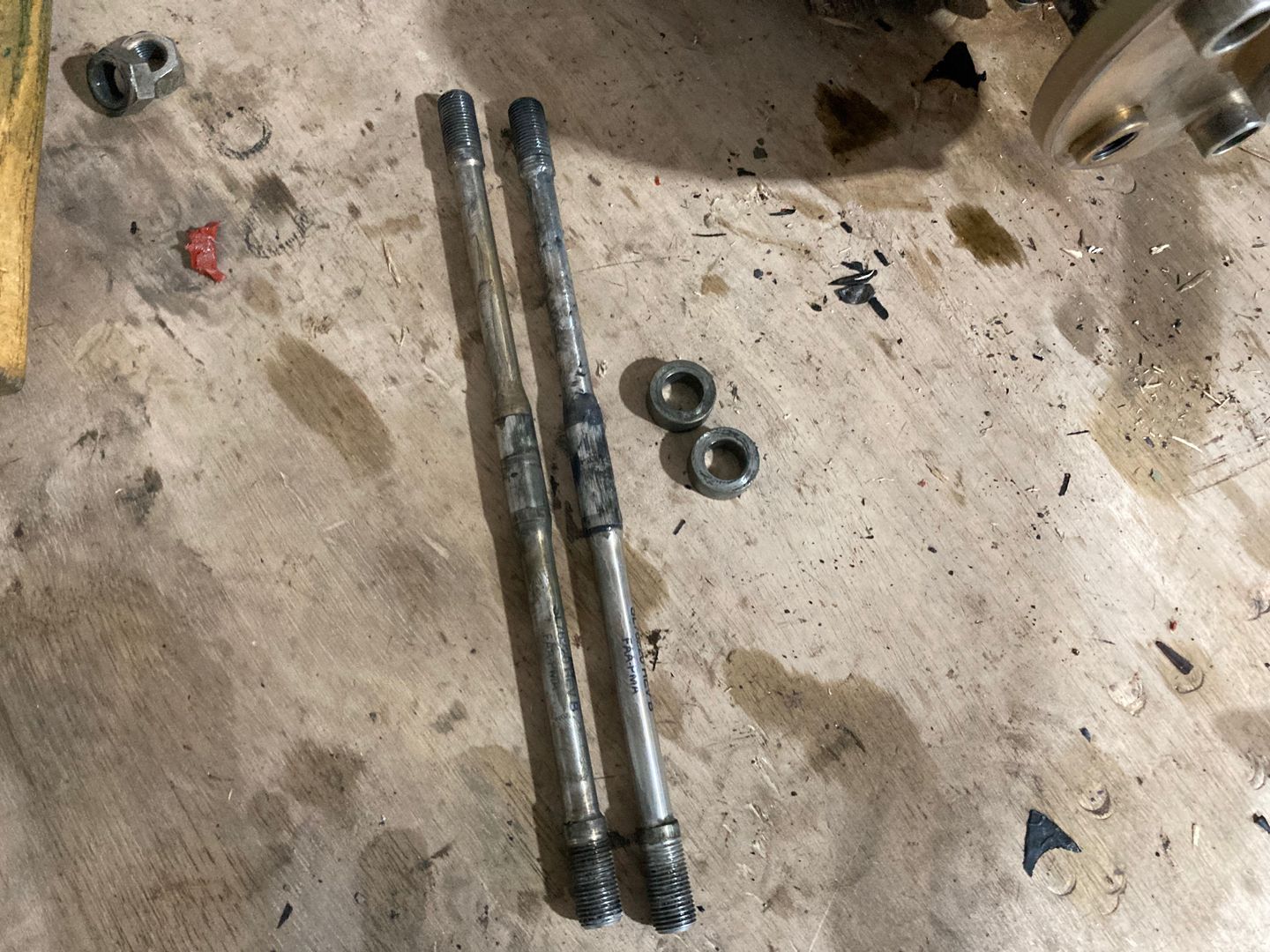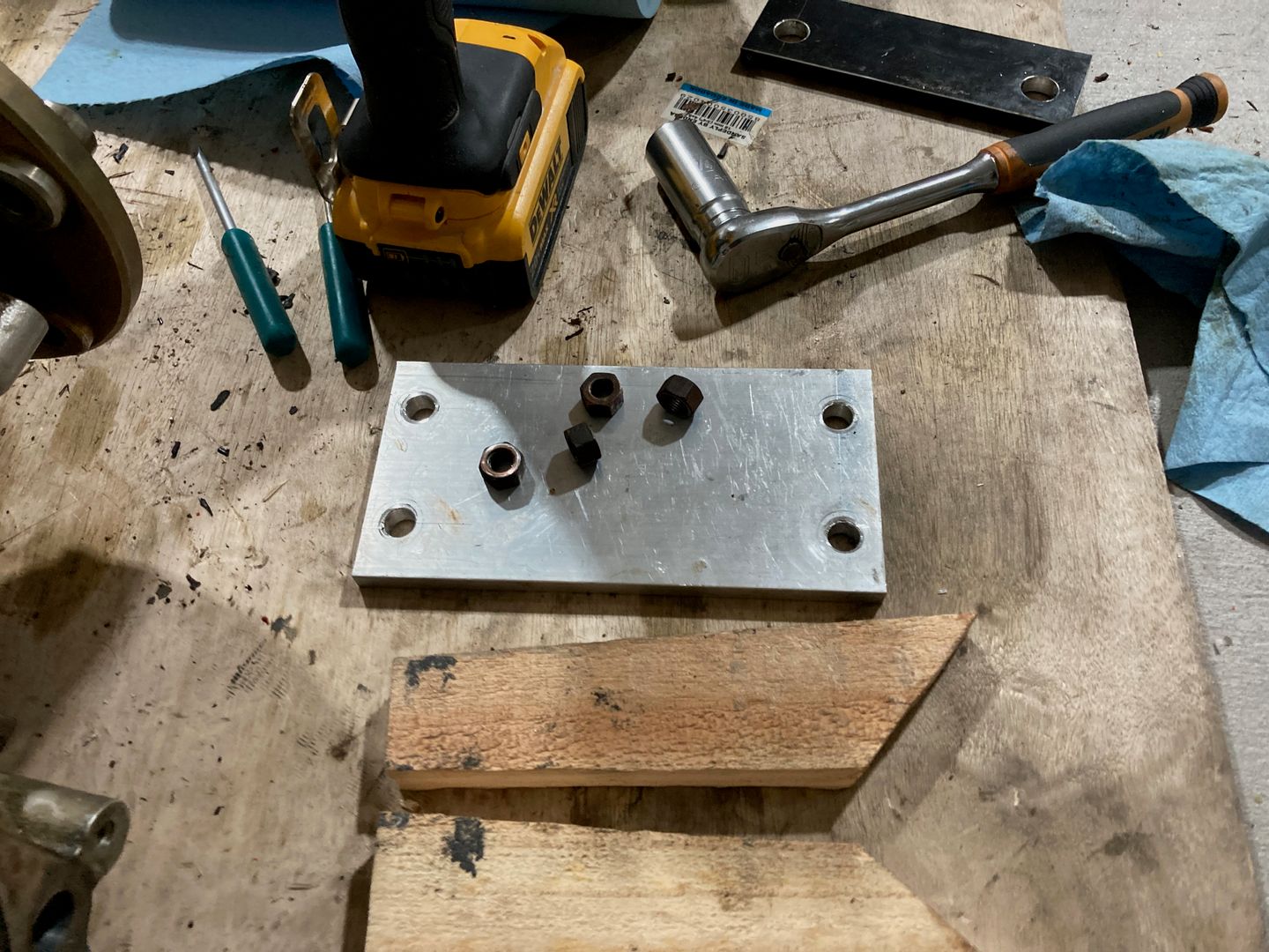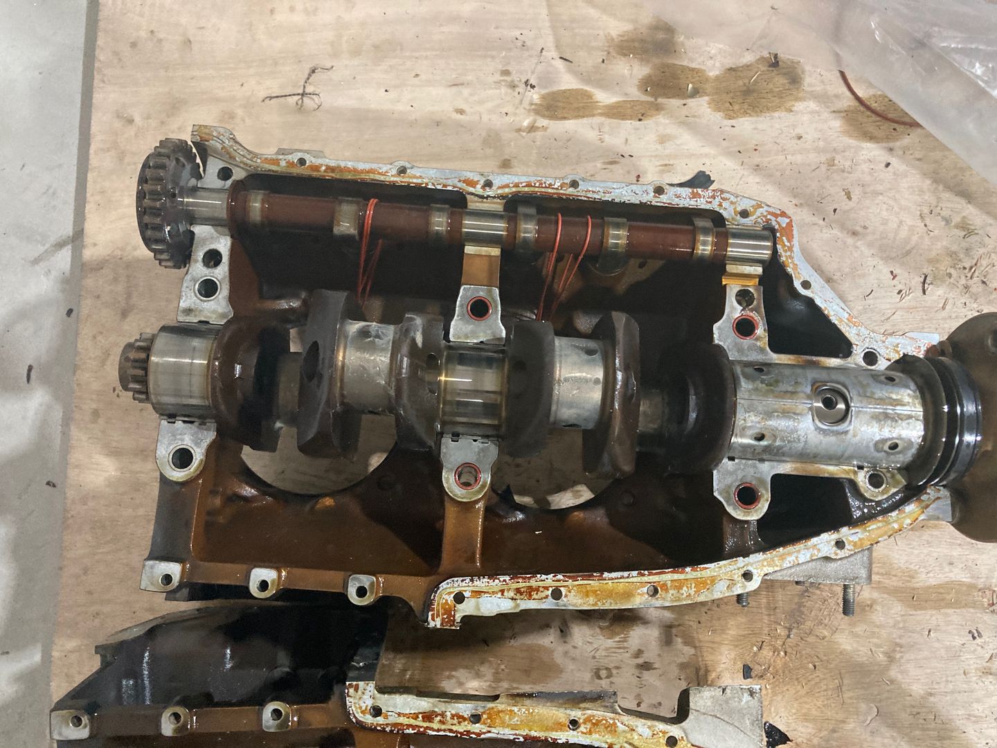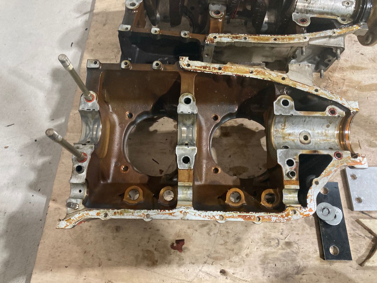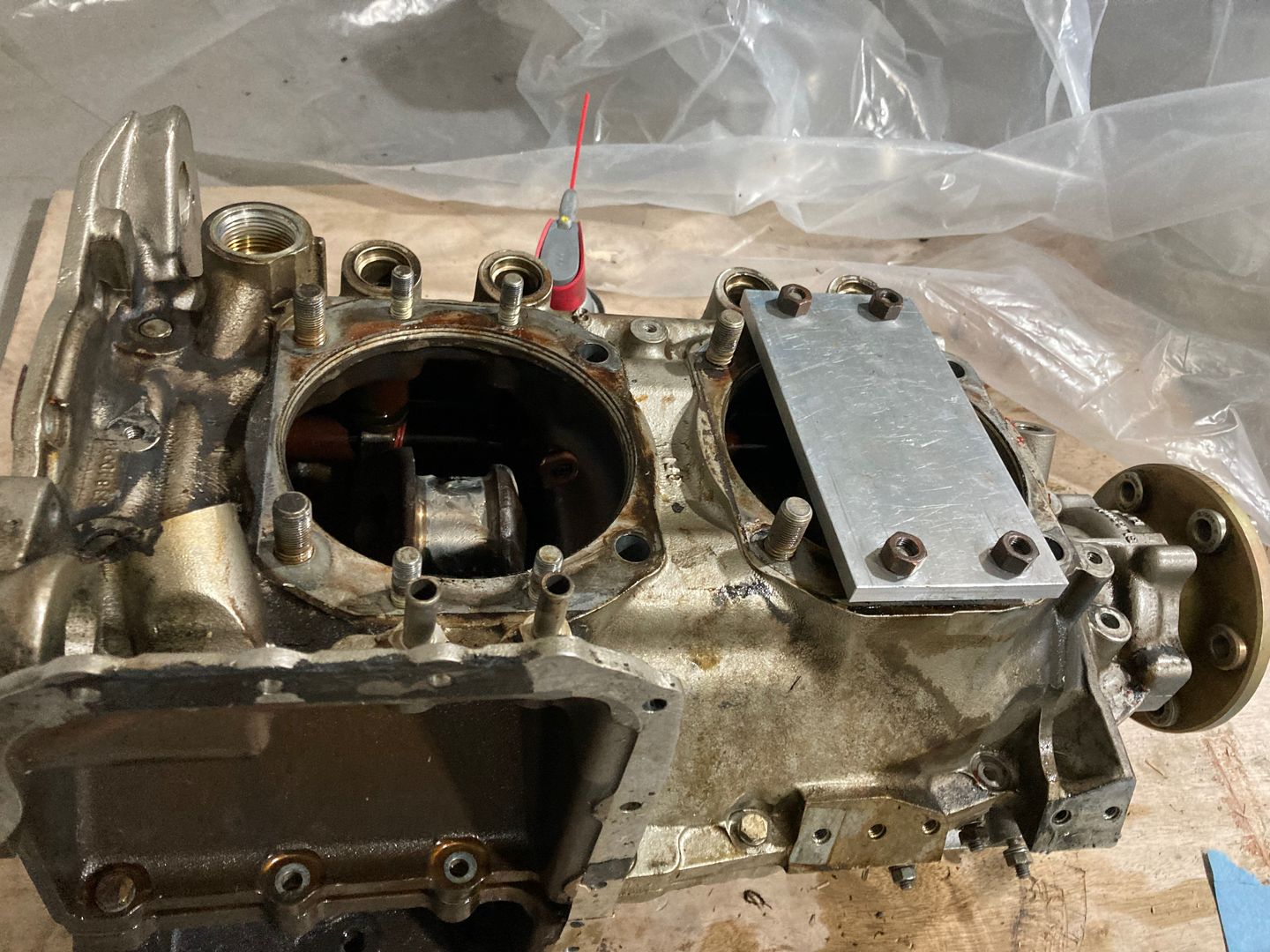 Then I moved to splitting the case. I used the tool on the right from the photo above. The idea is very simple: the plywood part goes against the crankshaft and then the plate pushes on it. Since only the two rear studs plus the sealant keep halves together, not much force is required.