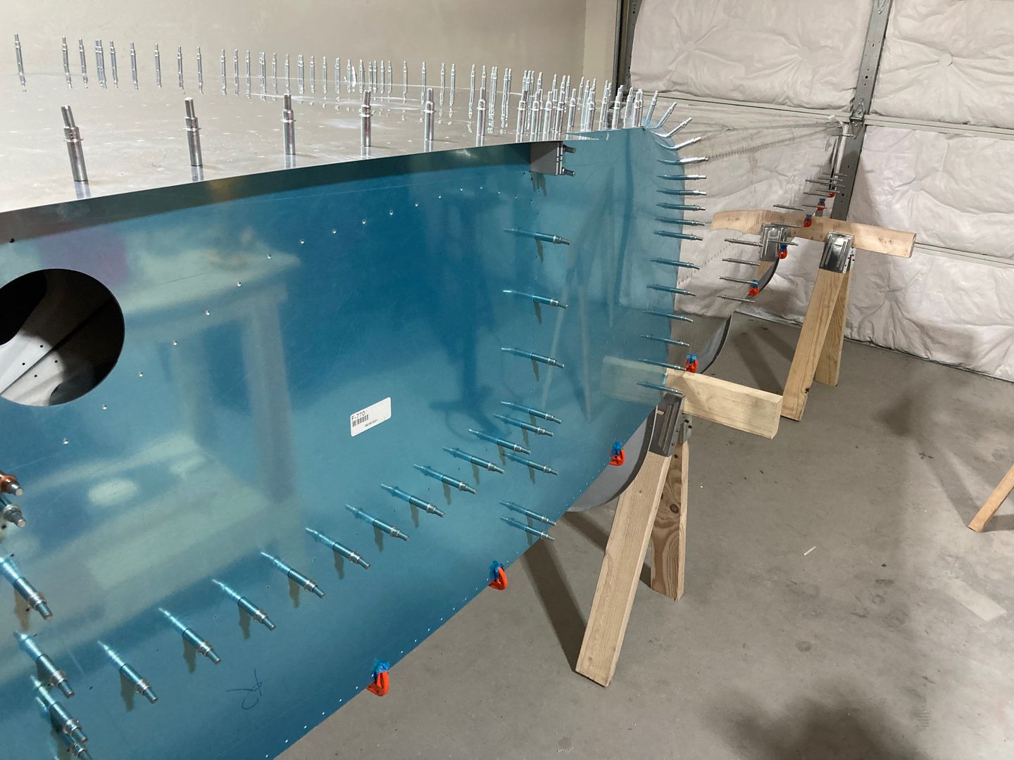 Finally, I put clamps to hold the right longeron in place. I only have 12 small clamps, and I used 10 of them, so I think I will do one longeron at a time.