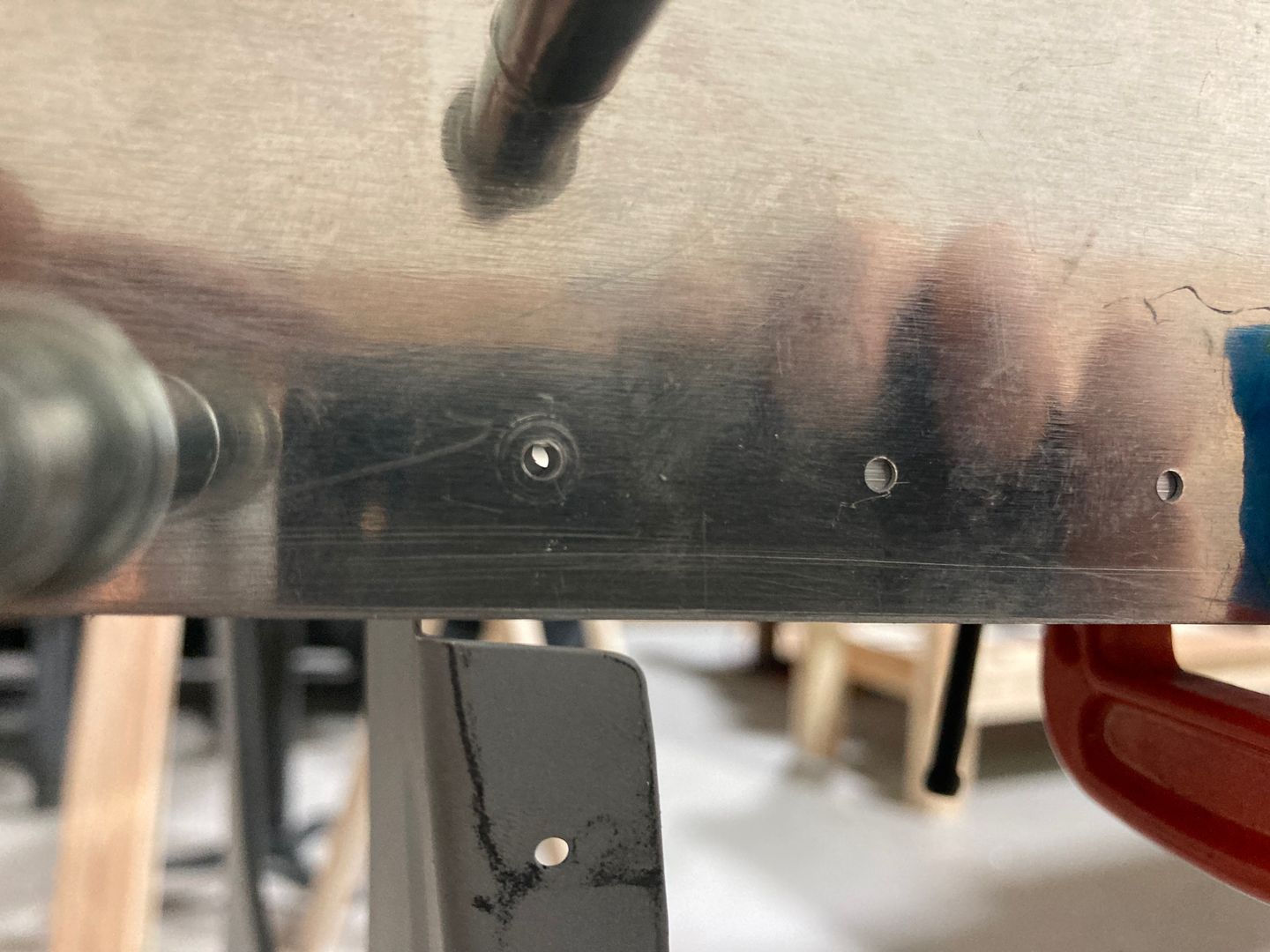 Several holes would match a hole in a bulkhead flange. Since these flanges would flex a lot, and an alignment of the holes is not guaranteed, I used a shim to make the drill stop before it gets to the flange. I would drill until I feel that drill hits the shim.