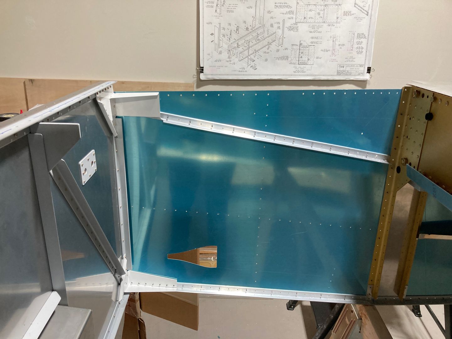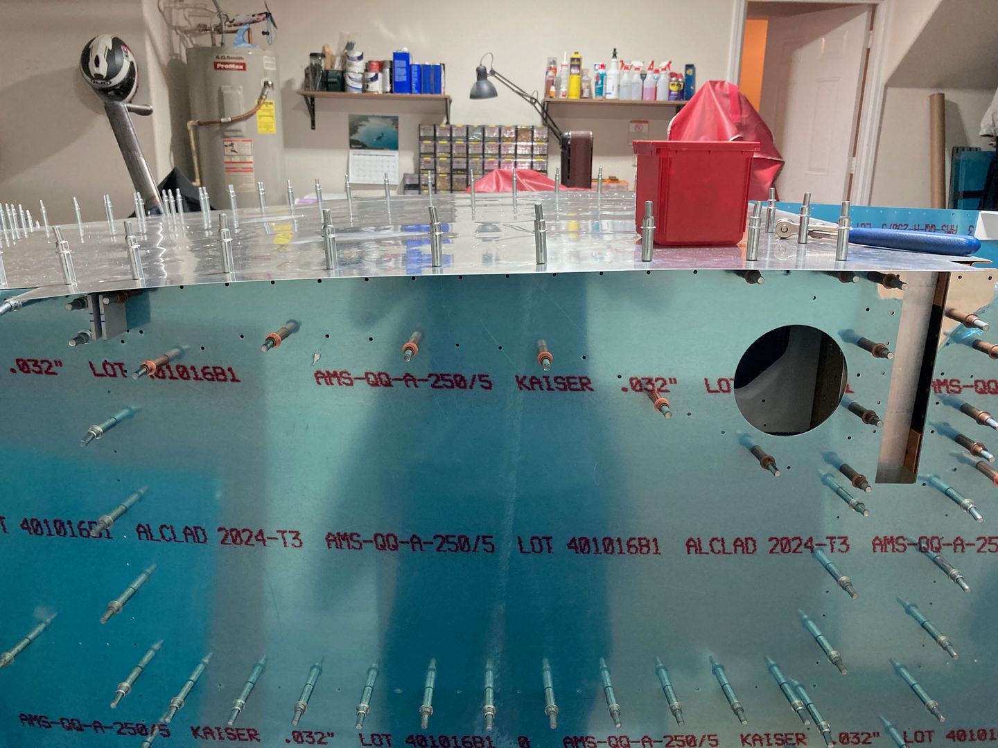 Then I drilled it to the skin. The hole in the middle that is on an intersection of two rivet lines in the skin is probably the most critical to the edge distance issues as an AN3 bolt will go through it. So I marked that hole first, center-punched it, and drilled it on the workbench, keeping it centered as much as I could.