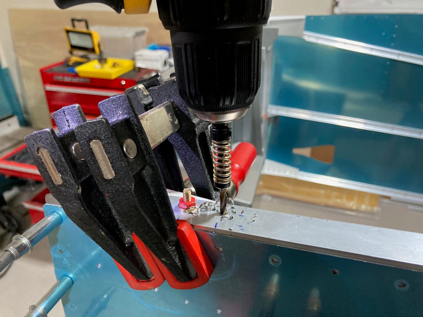 Then I clamped the longeron and drilled the #40 holes through the steel. This time I used an air drill to drill the steel, and it worked well. I think I am starting to like the air drill.