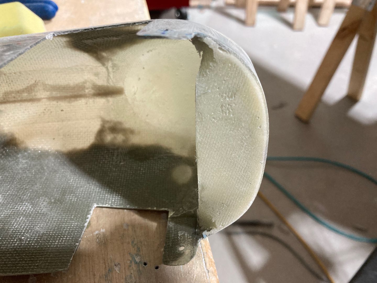 I wasn't impressed with the quality of the aft part of the rudder fairing. There were a few layers of fiberglass cloth that didn't stick to each other. It pretty much fell apart when I cut the hole. To reinforce it, I glued two layers of the fiberglass cloth from the outside.