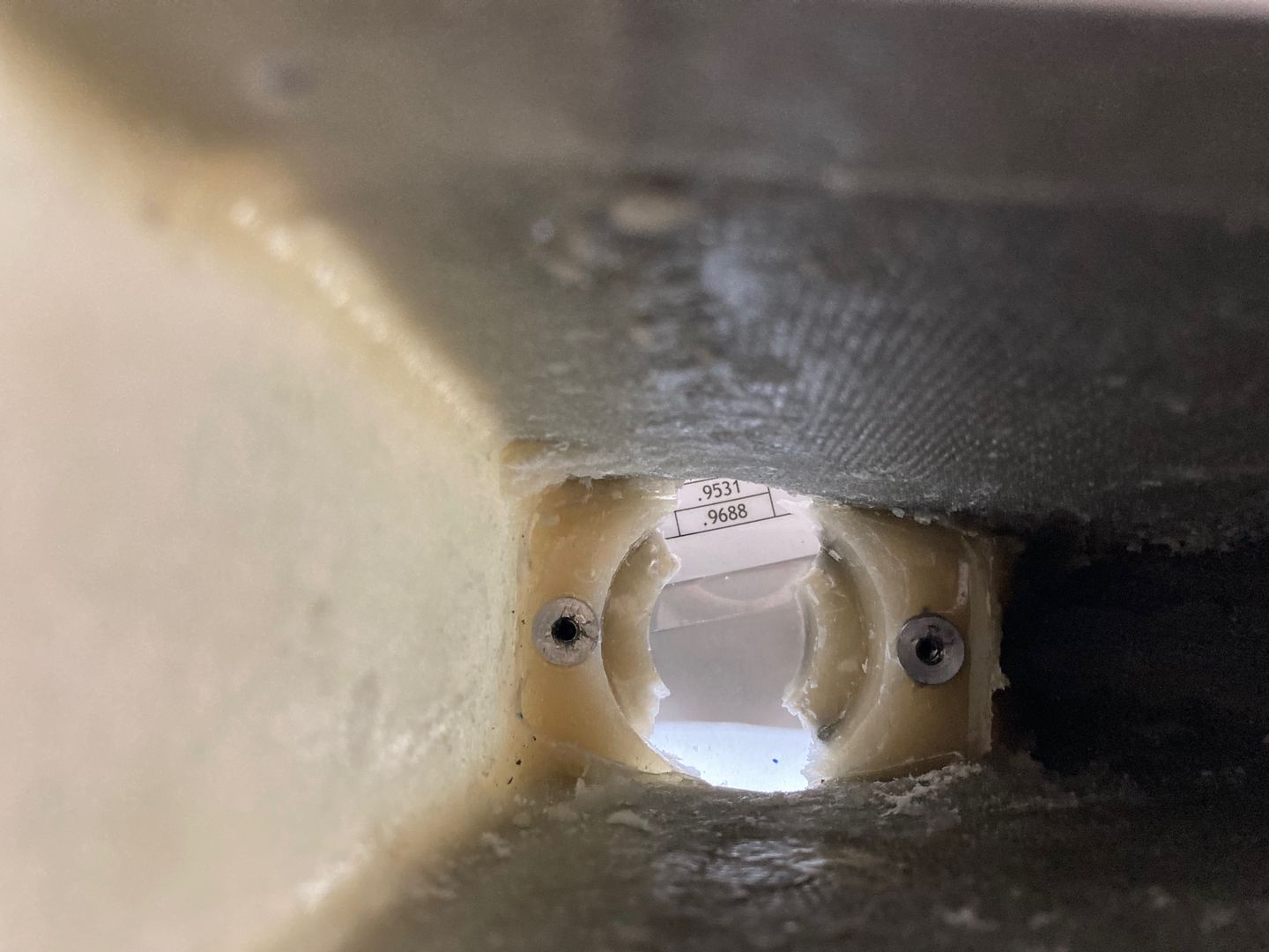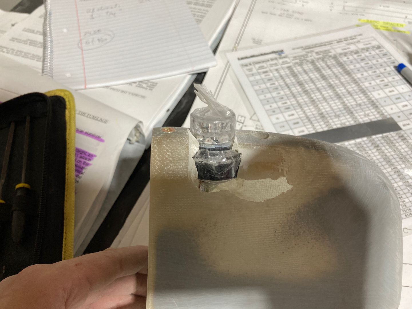 However, this is where I made a couple of mistakes. First, I managed to break off one of the screws -- it got stuck in the insert due to some remaining epoxy. Second, while removing the beacon, I broke off one of the epoxy flox seating areas from the fairing itself. Most likely due to poor bonding -- it was hard to sand the fairing inside since I had already installed the aft cap at that time and did not have good access for scuffing the area.