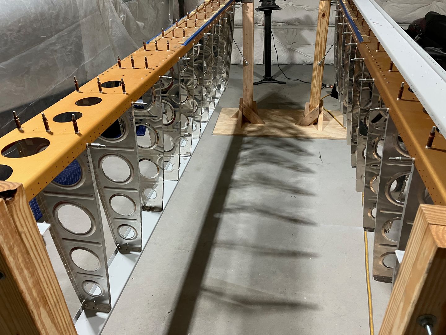 To test the wing stands, I put the ribs and the spars on the stand. The inboard side of the spar just simply rests on top of an angle in the stand. The outboard side has a mounting bracket (a piece of an angle) that is bolted to the most outboard rib. This bracket rests on an angle on the opposite side of the stand.