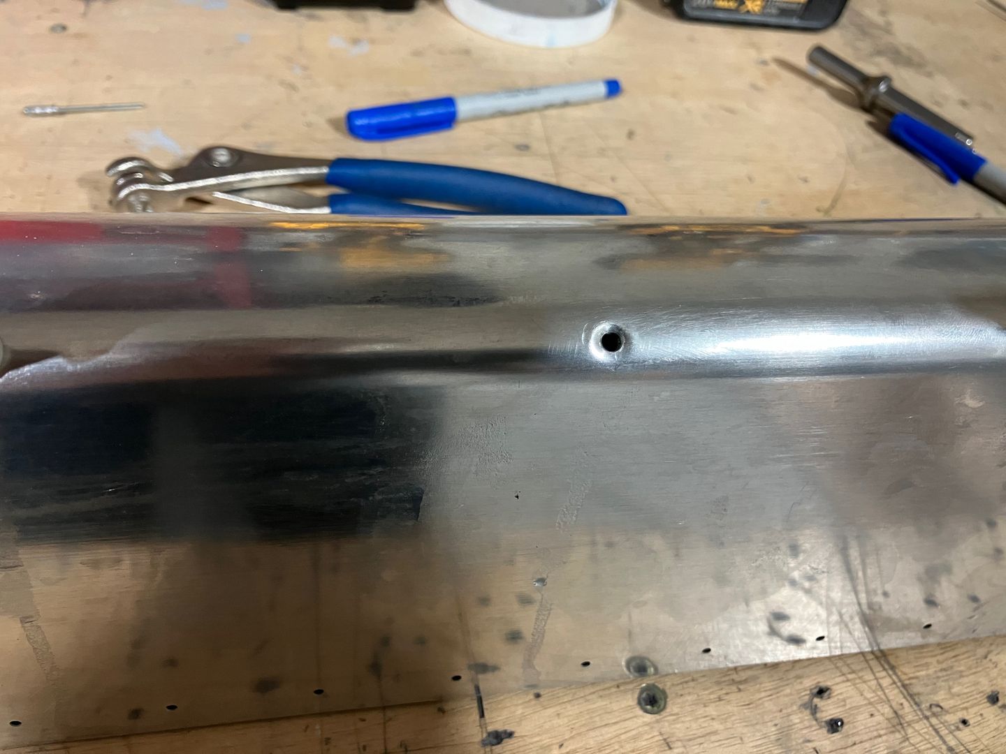 To make the dimples, I used a holder for the dimpling bits and smashed it with a hammer against the skin and the pipe. In that process, countersinks in the pipe work as female dies.