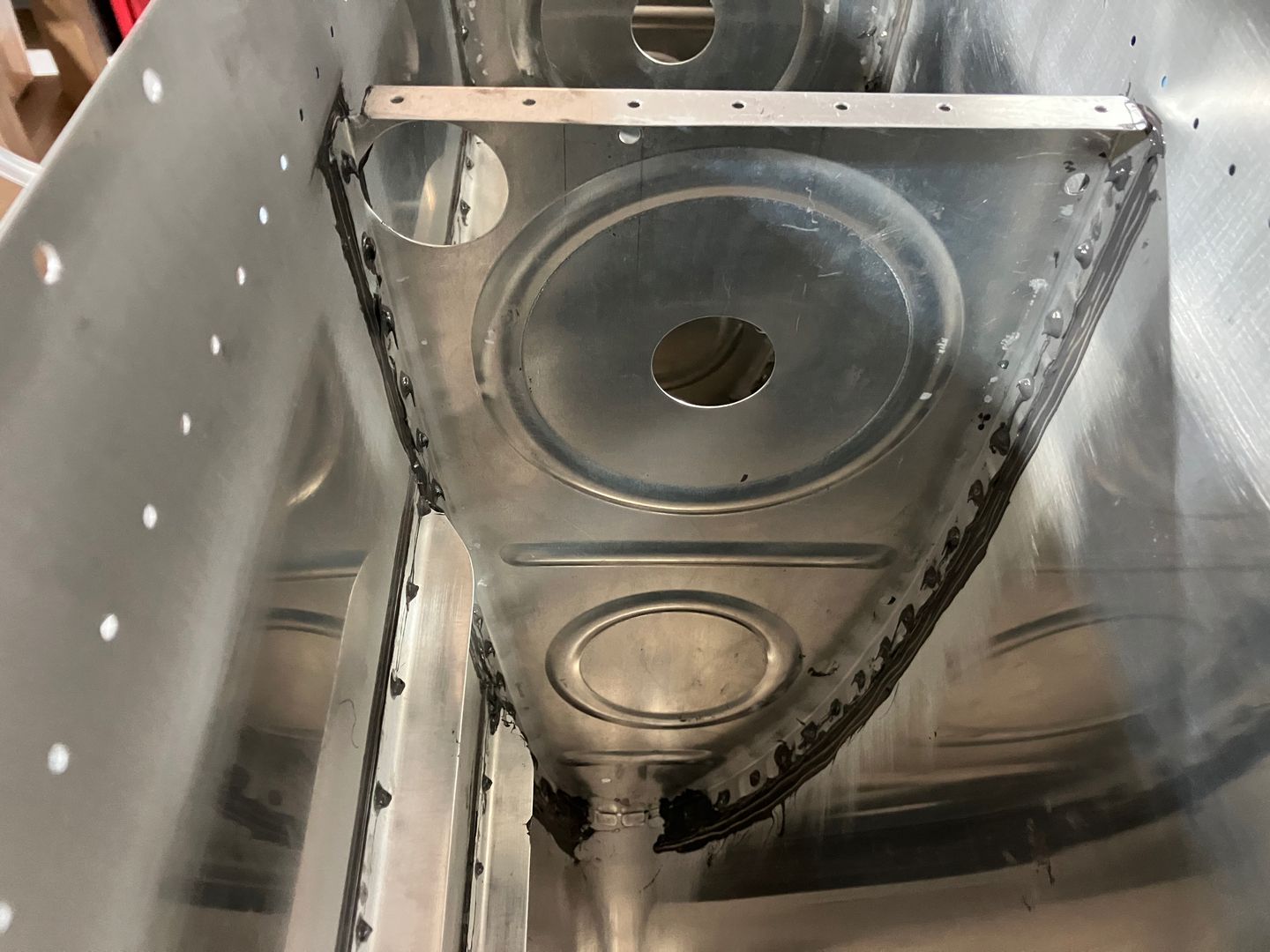 I start riveting from the leading edge, two rivets at a time. I remove two clecoes, remove the excess sealant from the rivet holes, put the rivets, then pick (with the tweezers) whatever sealant they push through the hole from their shop ends. Then, set them normally using the mushroom set and the bucking bar.