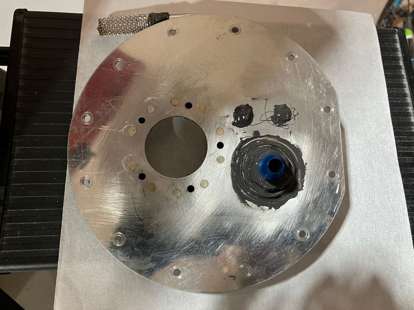 I riveted the nut plates and all the components to the fuel sender plate. I used the same technique I used for the reinforcement ring and the inboard ring -- a bit of the sealant on each of the nutplate, rivet them, then cover rivet shop ends with the sealant.