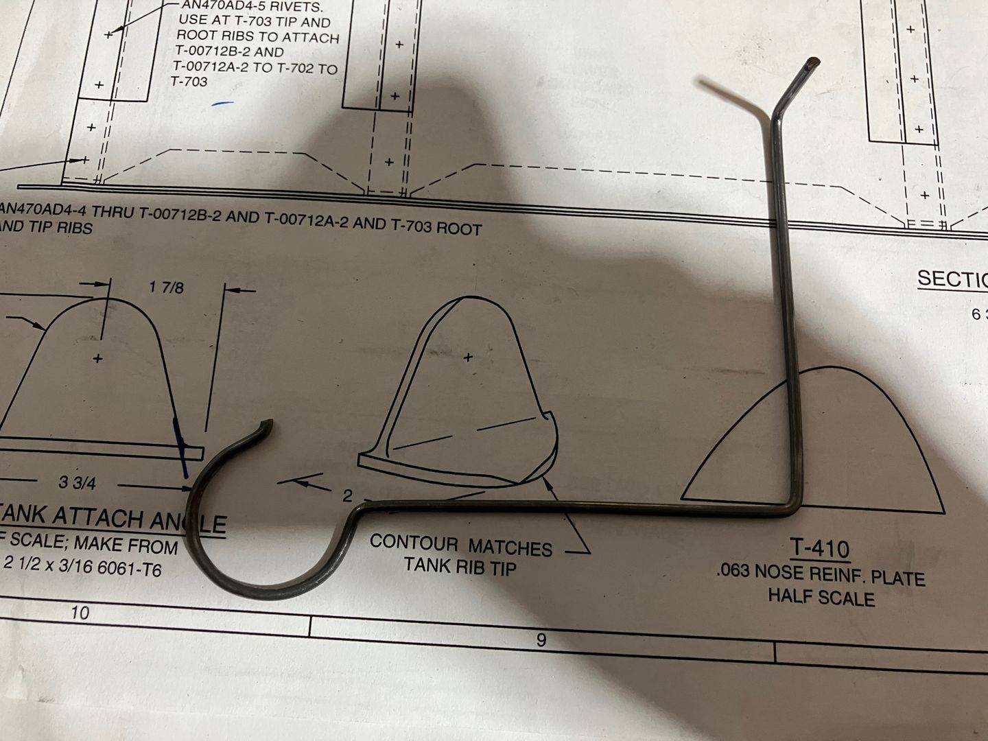 Wrapping up the fuel tank construction. First, I made a new arm from a 3/32" music wire. It looks close enough to what the original arm was made from.
