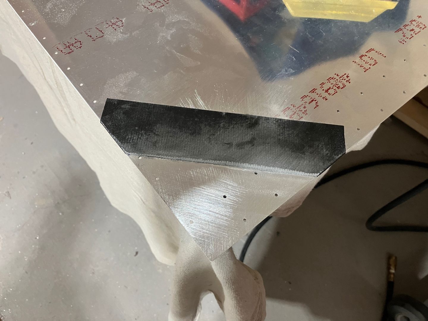 First, I deburred the top skins, to prepare them for priming. Then, I sanded corners of the top skins to create the "scarf joint" where two top skins overlap. I used Roloc discs for rough sanding, then sanding paper on a block to finish.