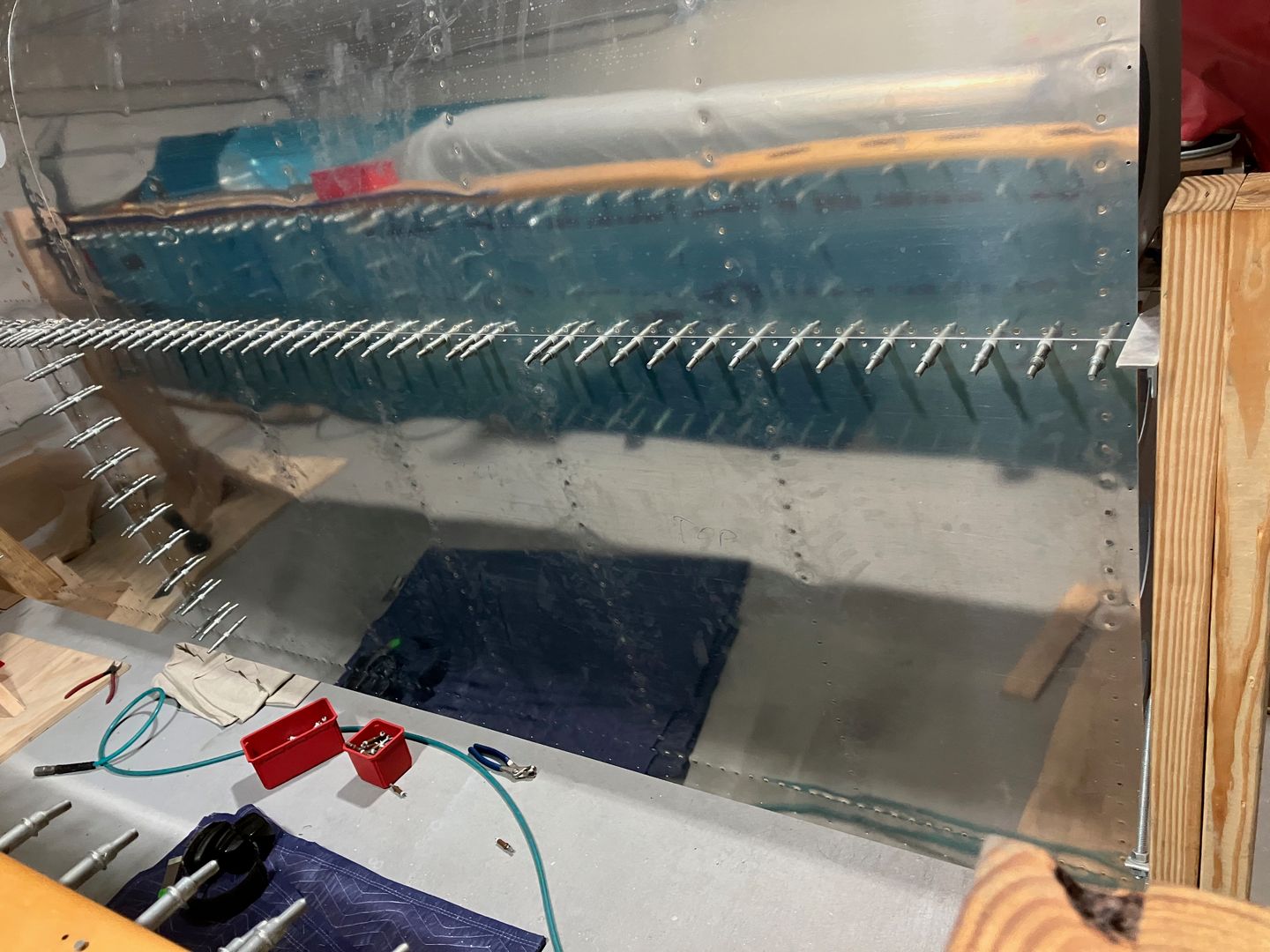 It all looked okay at first, but after carefully inspecting the rivets I didn't like how a lot of them were "skewing" to one side. I will be replacing them using the regular bucking procedure, with my son doing the rivet gun.