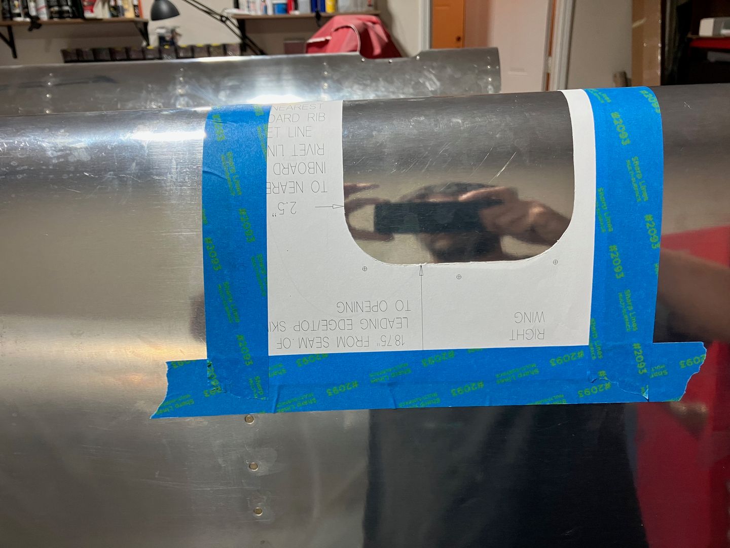 Then I started working on the landing lights cutout. First, I marked the leading edge using the template from the Duckworks kit, then cut the hole.