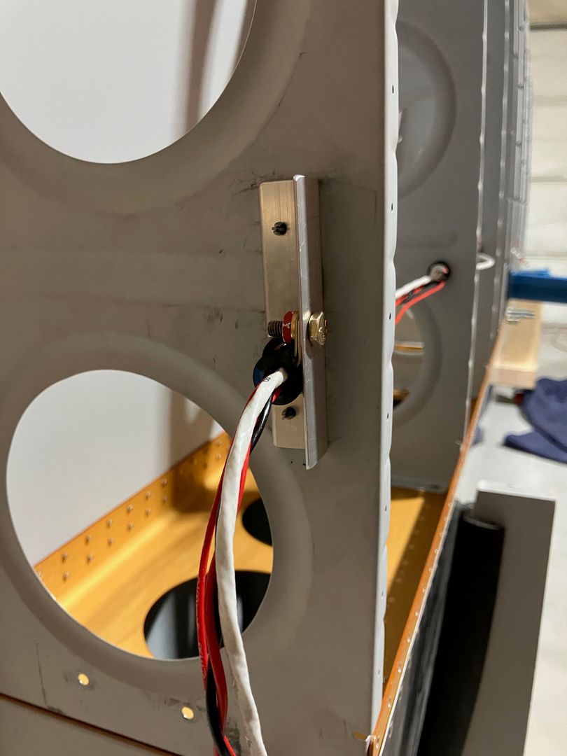 To make sure wires are held securely, I created simple angle brackets that allow for attaching an Adel clamp to the wires exiting at the wing tip. The issue with that location is that due to the reinforcement bead in the rib, I had to make a pretty long angle bracket so that it could be attached to the flat areas of the rib.