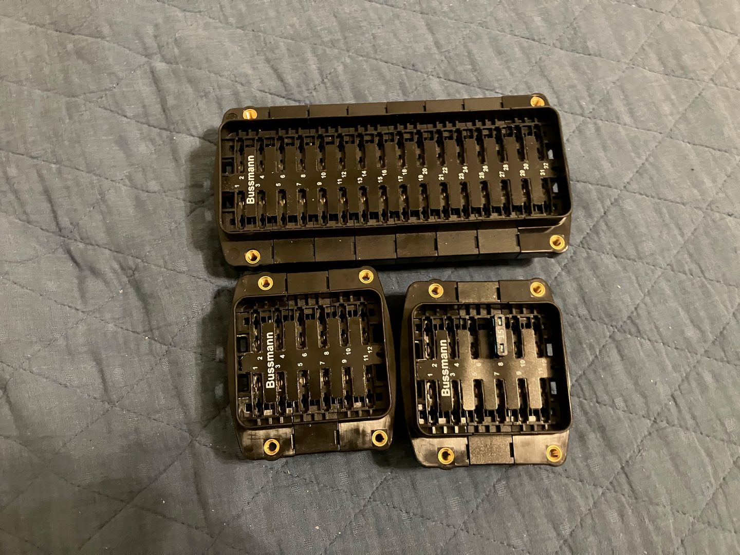 Also, got my Bussmann Series 15700 Rear Terminal ATC® Fuse Panels for main bus, joint avionics bus (for equipment that doesn't have two power inputs) and two independent avionics busses (for the equipment that have dual power inputs). The long panel is split 12+20, 12 for the joint avionics bus and 20 for the main bus.