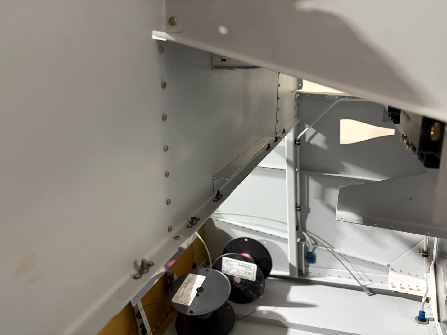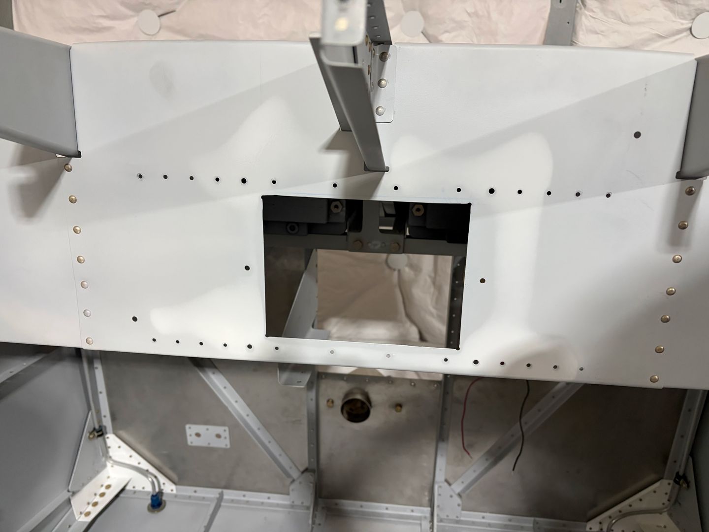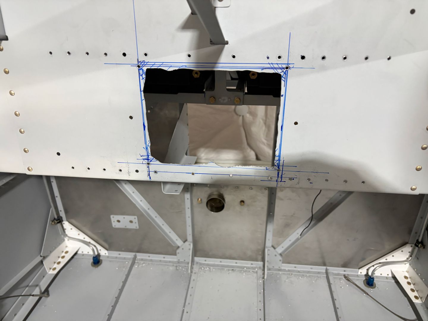And the installed cutout looks like this. The horizontal angles will transfer side-to-side loads (to reinforce the weakened flange), and the vertical angles will be used to attach the back of the avionics stack.